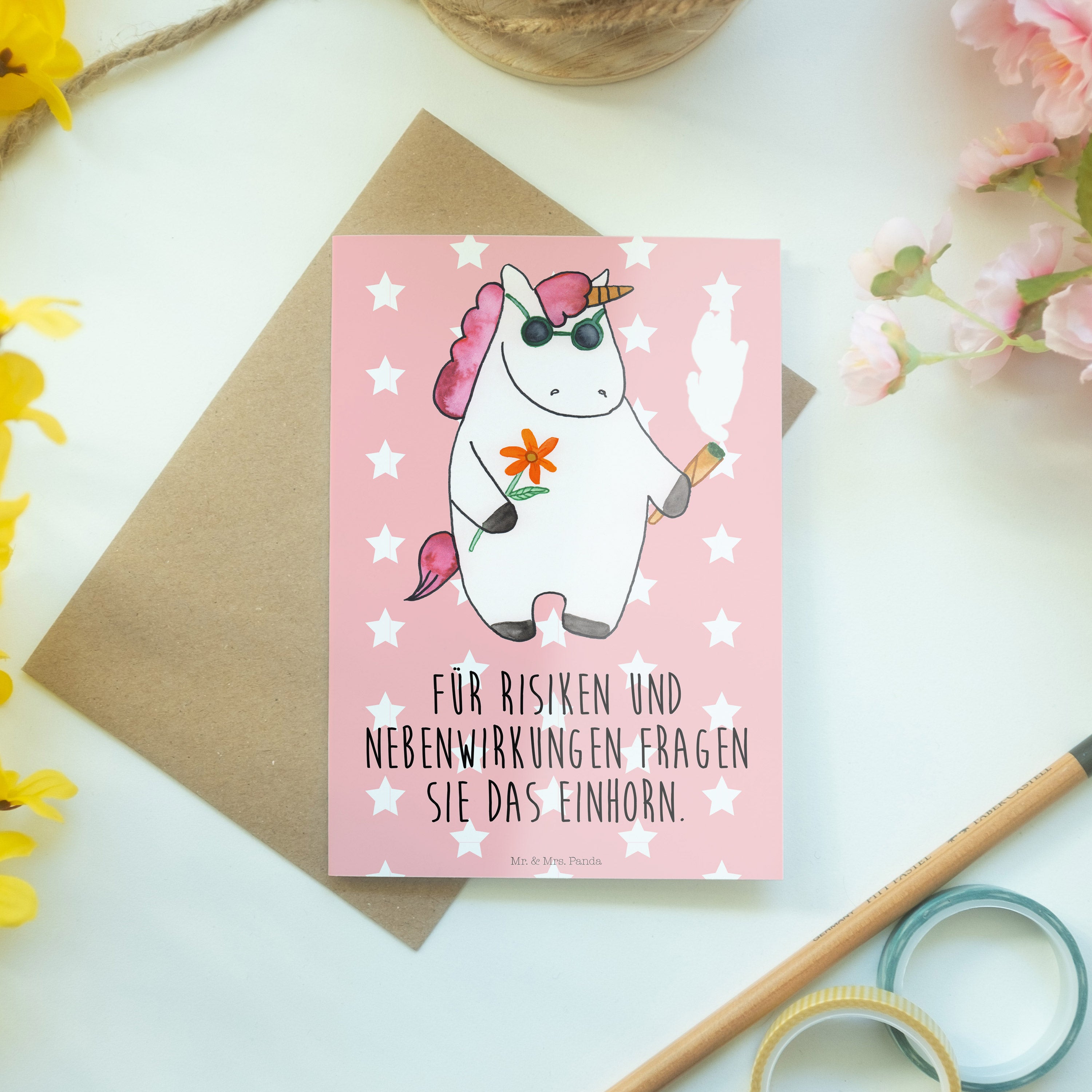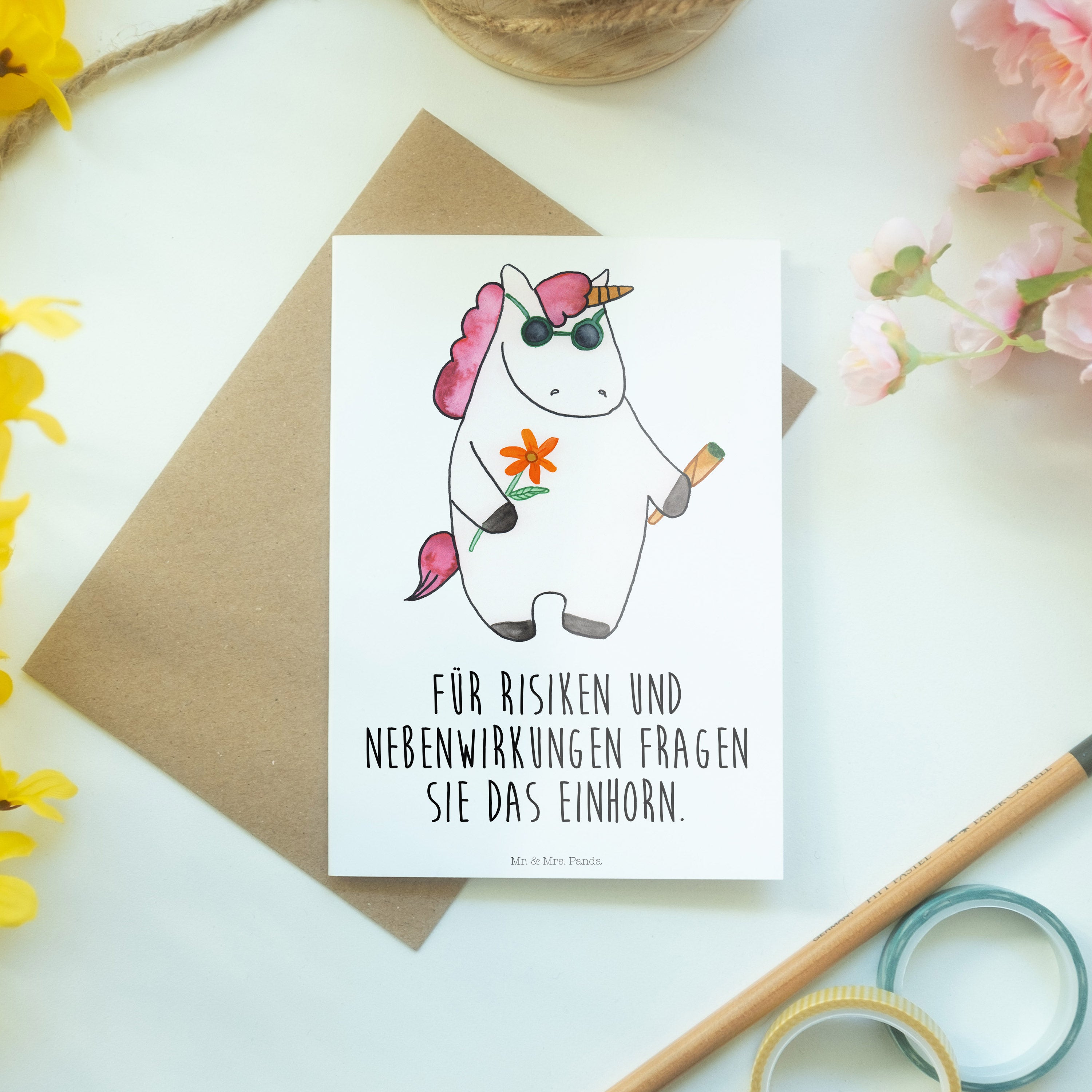 Pflegehinweis: Um die strahlenden Farben und die hohe Qualität deiner Mr. & Mrs. Panda Klappkarte zu bewahren, halte sie fern von direktem Sonnenlicht und Feuchtigkeit.