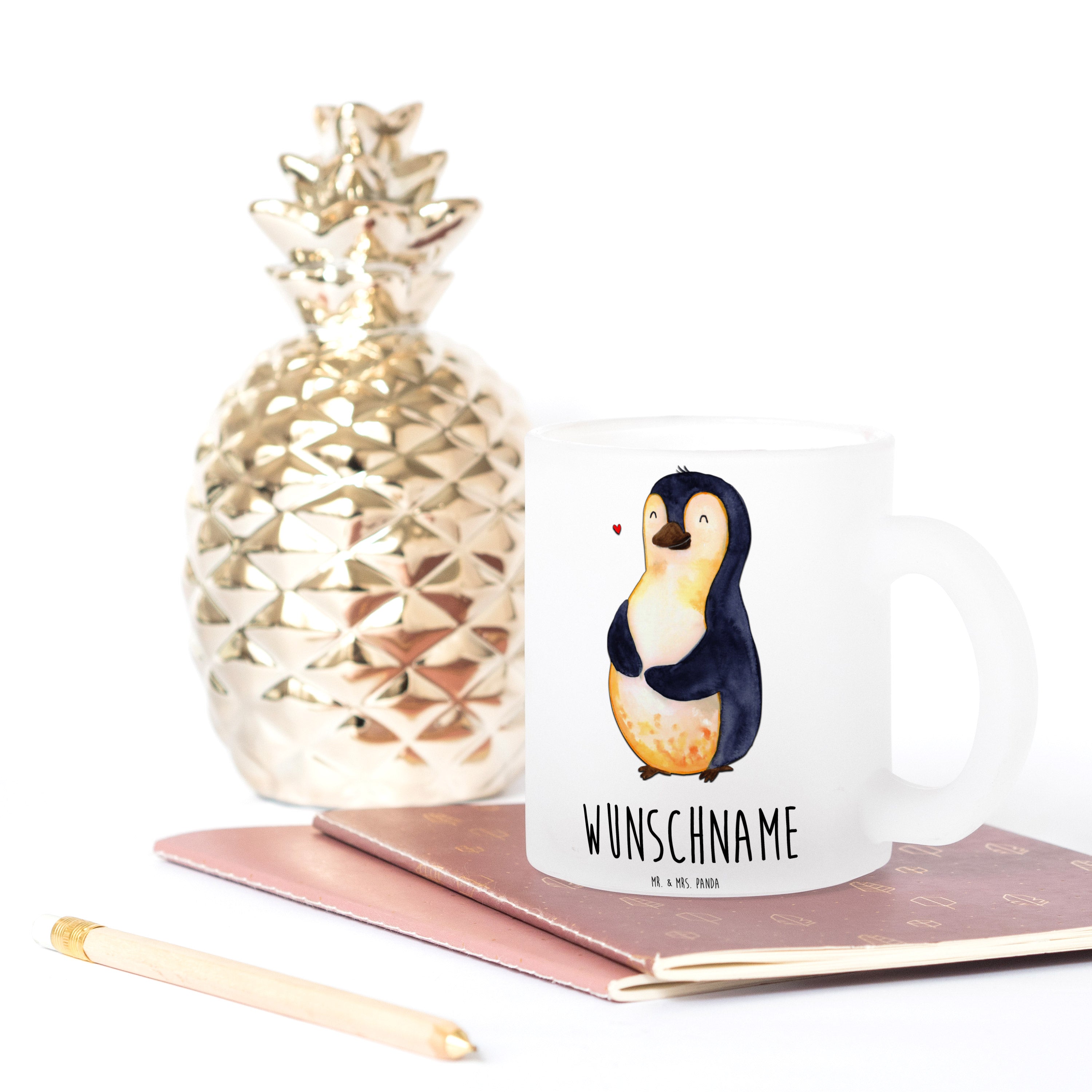 Verwandle jeden Tee-Moment in eine persönliche Erlebnisreise mit der personalisierten Teetasse von Mr. & Mrs. Panda. Dimensioniert mit 95 mm Höhe, 80 mm Durchmesser und einem Gewicht von 390 g, repräsentiert sie die ideale Kombination aus Stil und Zweckmäßigkeit. Das 3 mm dicke, extra stabile Glas garantiert Langlebigkeit und Widerstandsfähigkeit. Das Highlight: personalisiere die Tasse mit deinem Namen oder einem besonderen Satz und mache sie zu einem wahren Unikat. Die Tasse zeichnet sich durch eine satinierte Oberfläche und einen kratzfesten, hitzebeständigen Aufdruck aus. Dies macht sie zu einem Muss für jeden Teeliebhaber. Aufgrund der edlen Materialqualität empfehlen wir, die Tasse per Hand zu waschen, um sie in perfektem Zustand zu halten.