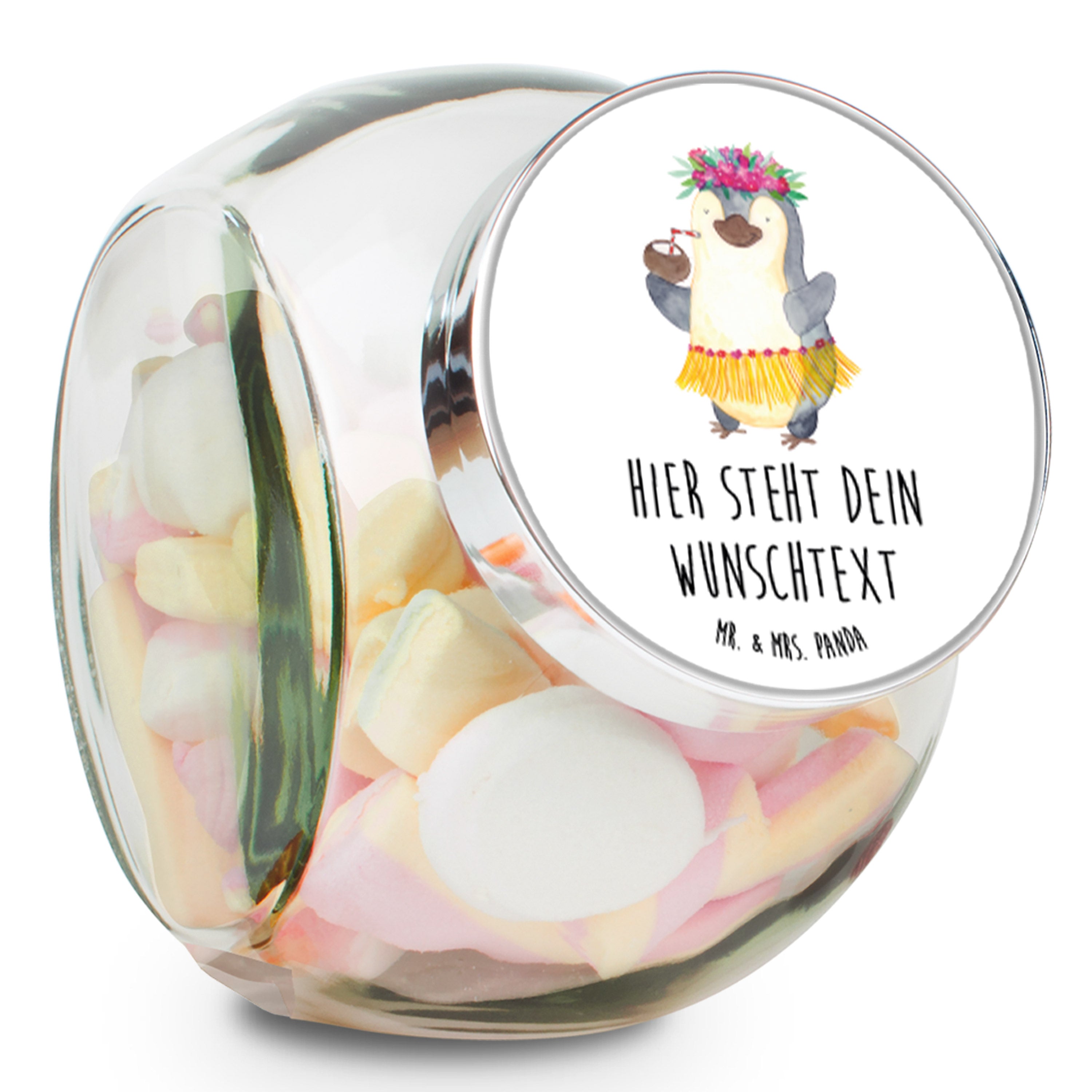 Mit dem personalisierten Bonbonglas von Mr. & Mrs. Panda gibst du deiner Küche oder Esszimmer einen ganz besonderen Flair. Ob als Gewürzdose, Teedose oder für köstliche Snacks – dieses multifunktionale Glas ist die ideale Wahl. Lasse es mit deinem Lieblingsmotiv von Mr. & Mrs. Panda versehen und setze ein Highlight in deinem Wohnambiente. Du kannst das Glas stehend oder schräg verwenden, ganz nach deinen Wünschen und Bedürfnissen. Die Lebensmittelechtheit macht es zum perfekten Behälter für nahezu alles, was du aufbewahren möchtest. Der silberfarbene Schraubverschluss sorgt dafür, dass alles frisch bleibt. Mit einem Volumen von 2000 ml und einem Gewicht von 400 g ist das Glas groß genug für eine reichhaltige Vorratshaltung, aber dennoch handlich in seiner Form. Mach es zu deinem persönlichen Küchenhelfer, der Stil und Praktikabilität vereint.