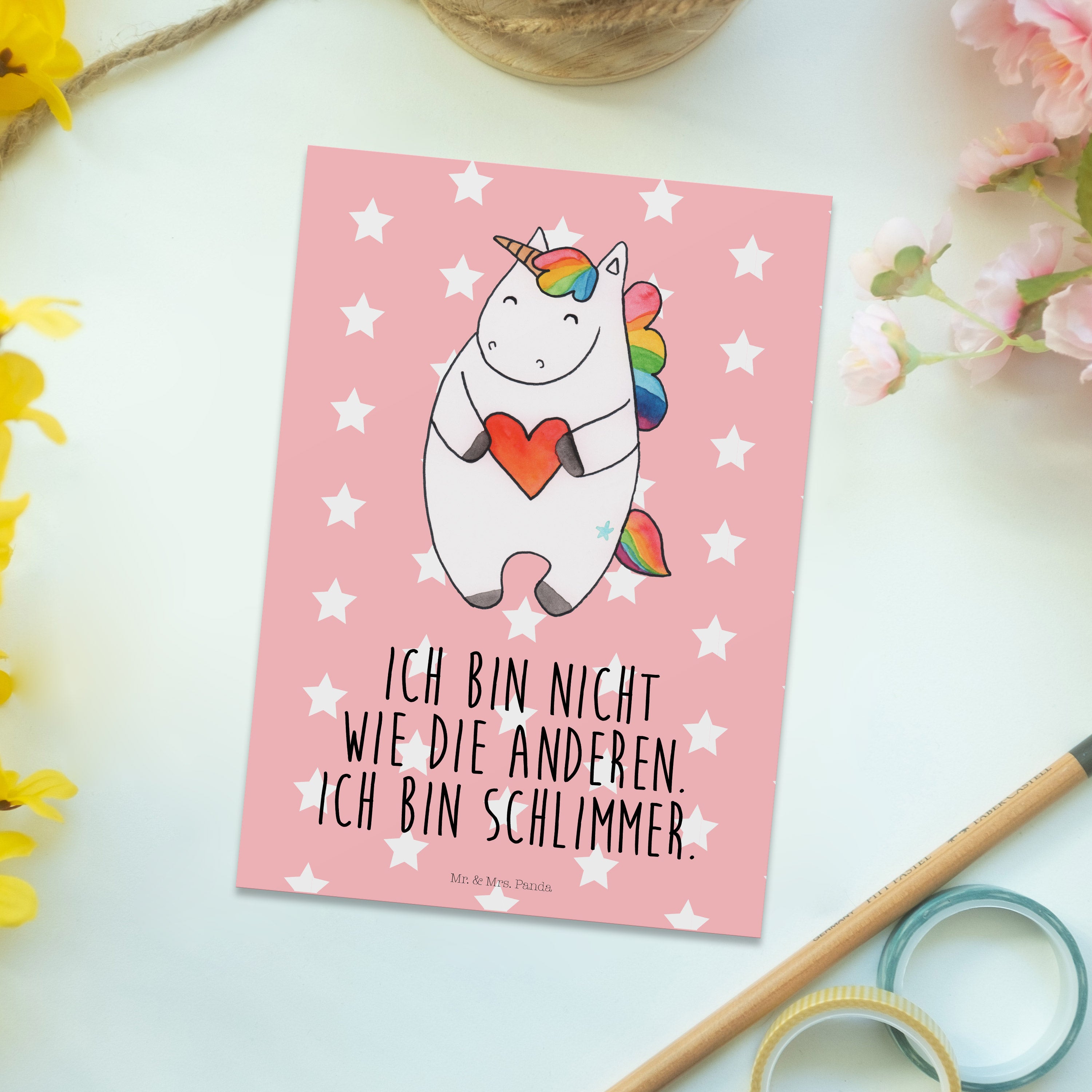 Mit einer Postkarte von Mr. & Mrs. Panda sendest du nicht nur eine Nachricht, sondern auch ein kleines Stück Herz. Jede Karte ist ein Unikat, perfekt geeignet als Einladungskarte für besondere Anlässe oder als kleine Aufmerksamkeit zwischendurch. Diese Postkarten sind nicht nur ein Blickfang wegen ihrer liebevoll gestalteten Motive, sondern auch hochgradig personalisierbar dank der blanko Rückseite. Mit den Maßen 150 mmx1 mm und aus hochqualitativem Karton hergestellt, garantieren sie Zufriedenheit und langanhaltende Freude. Die langlebige Tinte und die hochglänzende Vorderseite sorgen dafür, dass deine Nachrichten immer in Erinnerung bleiben.
