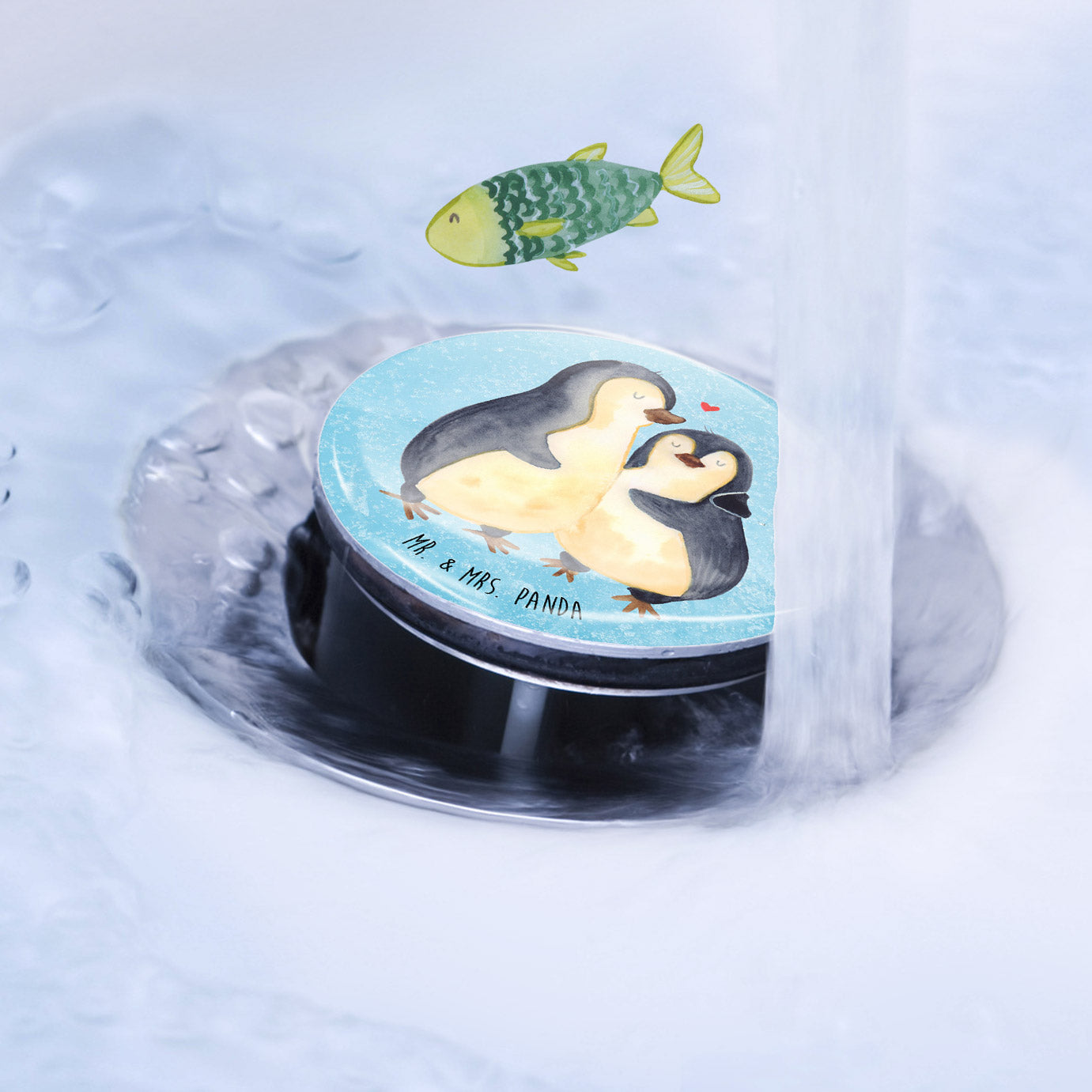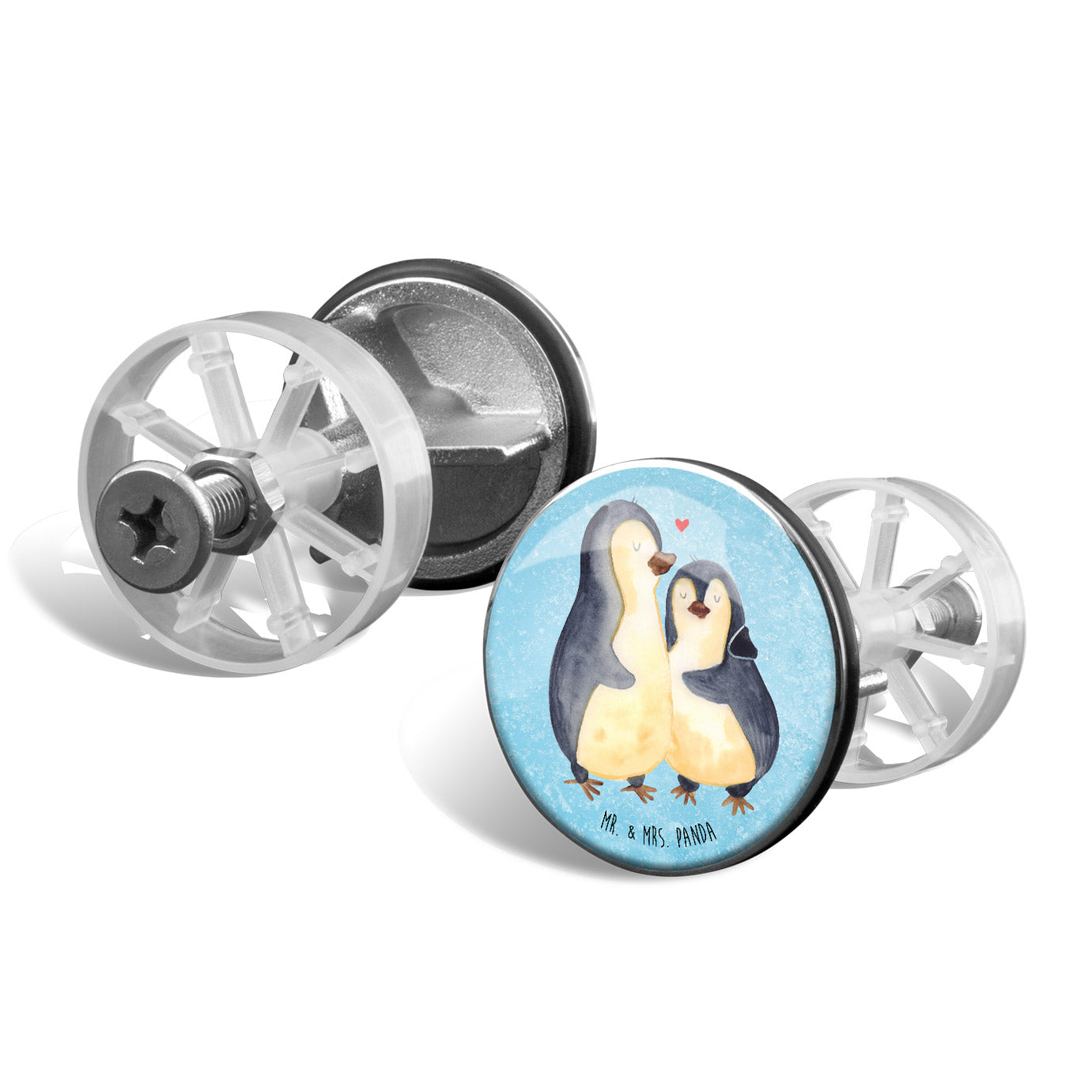 Ergänze Dein Badezimmer um ein dekoratives und nützliches Accessoire mit dem Mr. & Mrs. Panda Waschbecken Stöpsel. Dieser hochwertige Stöpsel, 72 mm in der Höhe und 40 mm im Durchmesser, aus verchromtem Messing hergestellt, kombiniert Funktionalität mit Design. Mit einem speziellen Haarfangsieb ausgestattet, sorgt er dafür, dass der Abfluss immer schön sauber bleibt. Seine Höhe lässt sich problemlos anpassen, daher passt er perfekt in jedes Waschbecken. Seine robuste Beschichtung gewährleistet eine lange Lebensdauer und macht ihn zum idealen Begleiter im täglichen Gebrauch. Einfache Reinigung unter lauwarmen Wasser ohne Reinigungsmittel macht ihn zusätzlich attraktiv.